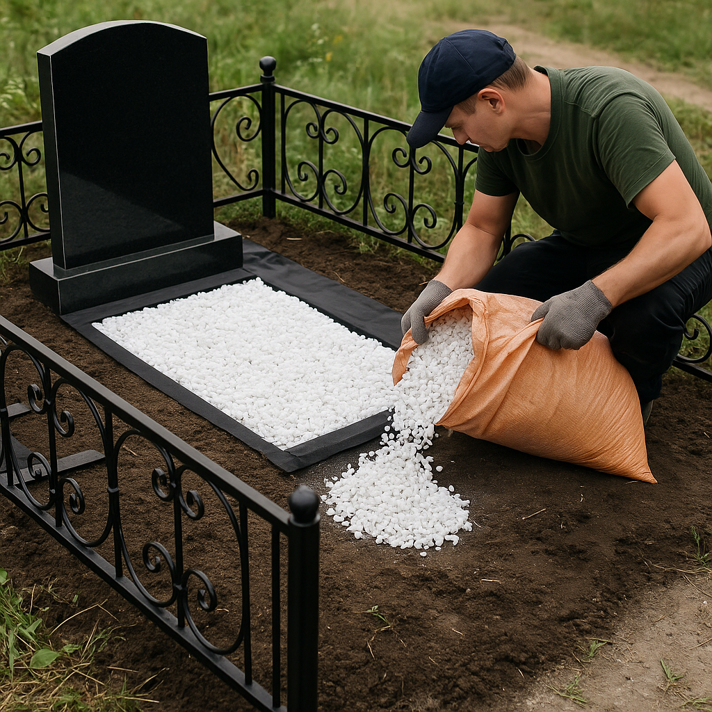 Засыпка участка мраморной крошкой — современное и эстетичное решение благоустройства захоронения. Этот способ придаёт участку аккуратный и ухоженный вид без значительных затрат, не требует трудоёмкой подготовки и выполняется в короткие сроки. Мраморная крошка — натуральный материал, устойчивый к перепадам температур и осадкам, не загрязняет окружающую среду и сохраняет привлекательный внешний вид на долгие годы. Её использование предотвращает рост сорняков и защитит памятник и ограду от загрязнений в непогоду. Этапы работ включают: — демонтаж лавок, столов и других конструкций; — очистку участка от травы, мусора и корней; — выравнивание и укладку защитной плёнки (по желанию — в несколько слоёв); — подсыпку и трамбовку песчаной подушки; — засыпку и выравнивание мраморной крошки; — установку элементов обратно и, по необходимости, добавление плодородного грунта в цветники. Компания «Реквием» выполняет данные работы качественно и аккуратно. Стоимость зависит от объёма работ и пожеланий клиента — уточняйте у наших специалистов.